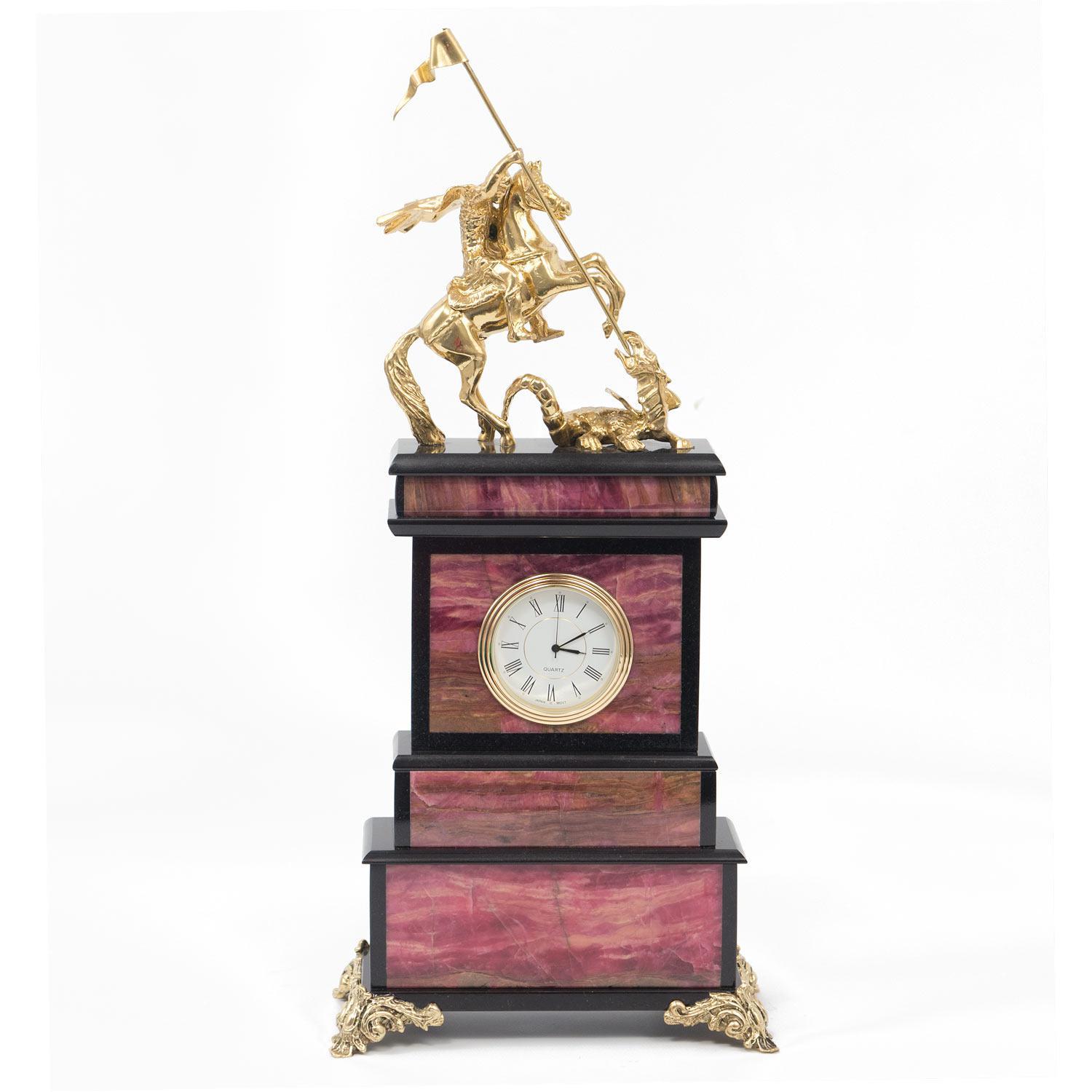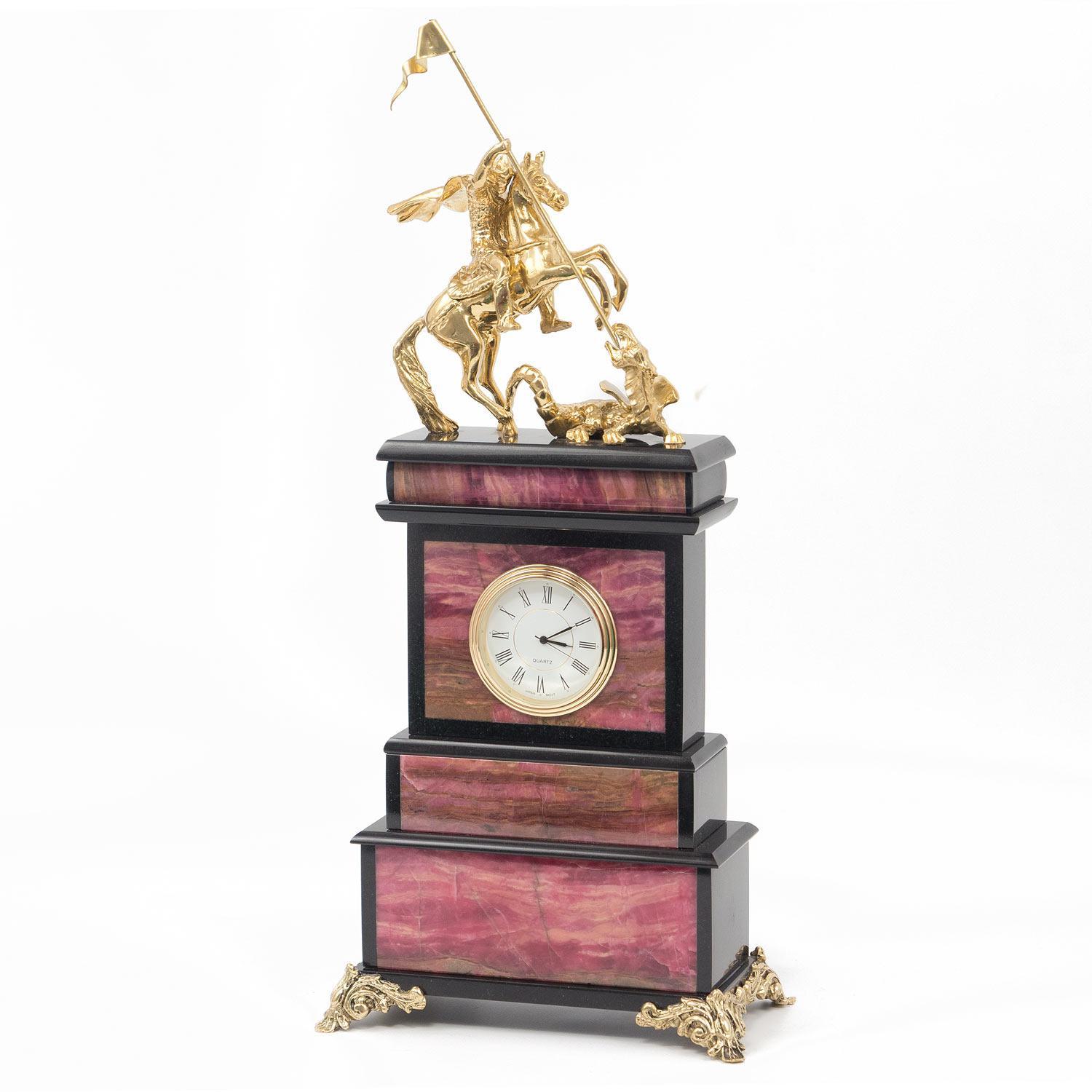 Часы из родонита с бронзовым Георгием Победоносцем. Это оригинальный подарок, который останется на долгую память, и будет храниться на видном месте.