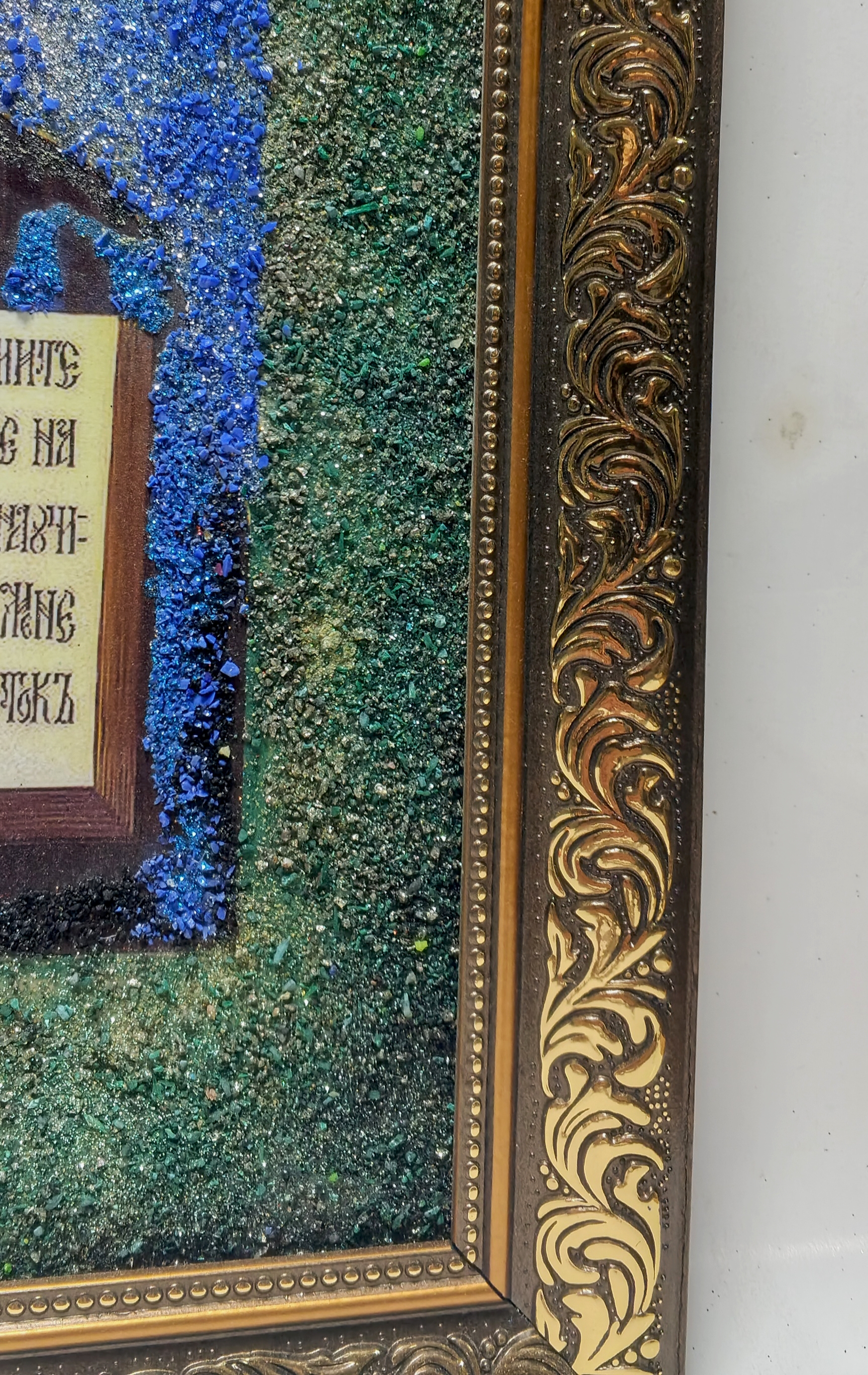 Икона" Спаситель" репродукция с подсыпкой натуральной (малахит, змеевик, пирит, кварц) и искусственно выращенной каменной крошкой изготовлена вручную в рамке из пластикового багета.