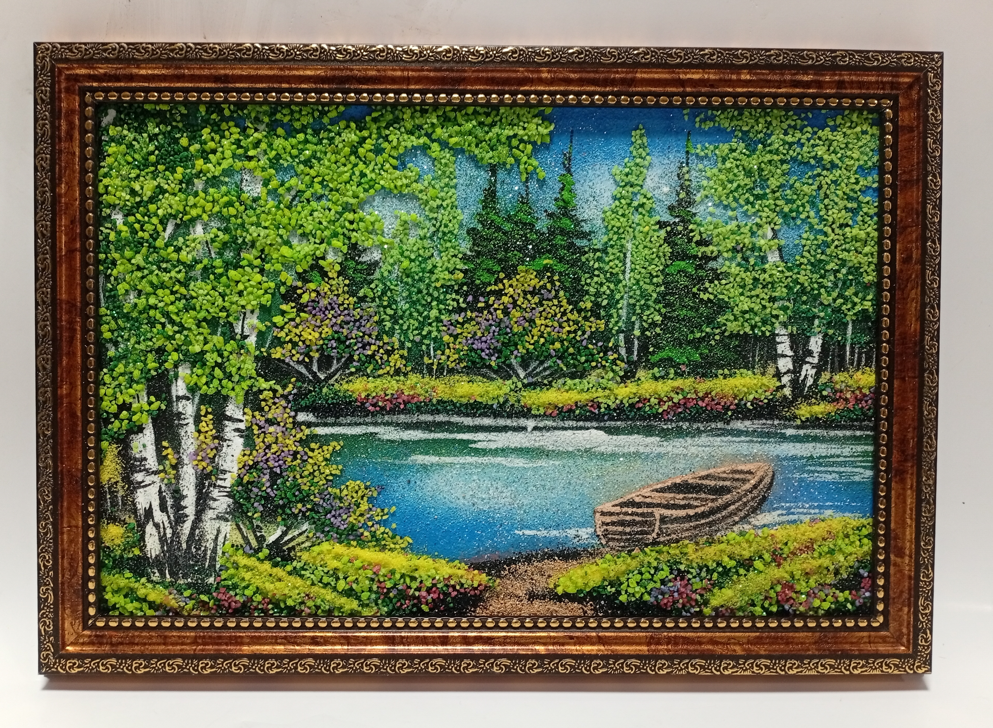 Картина изготовлена вручную с натуральной и тонированной каменной крошкой в пластиковом багете.