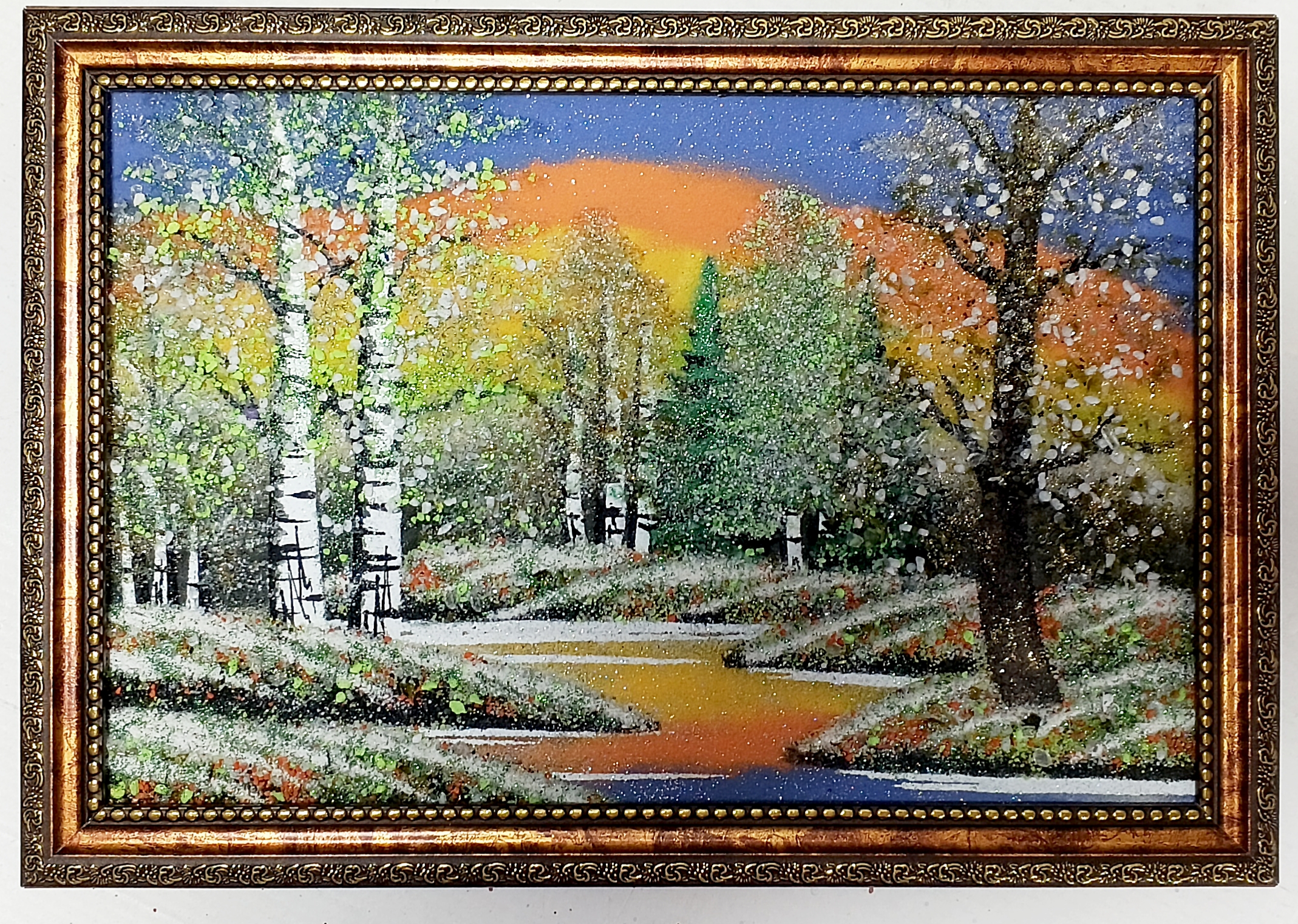 Картина изготовлена вручную из натуральной и тонированной каменной крошкой в рамки из пластикового багета.