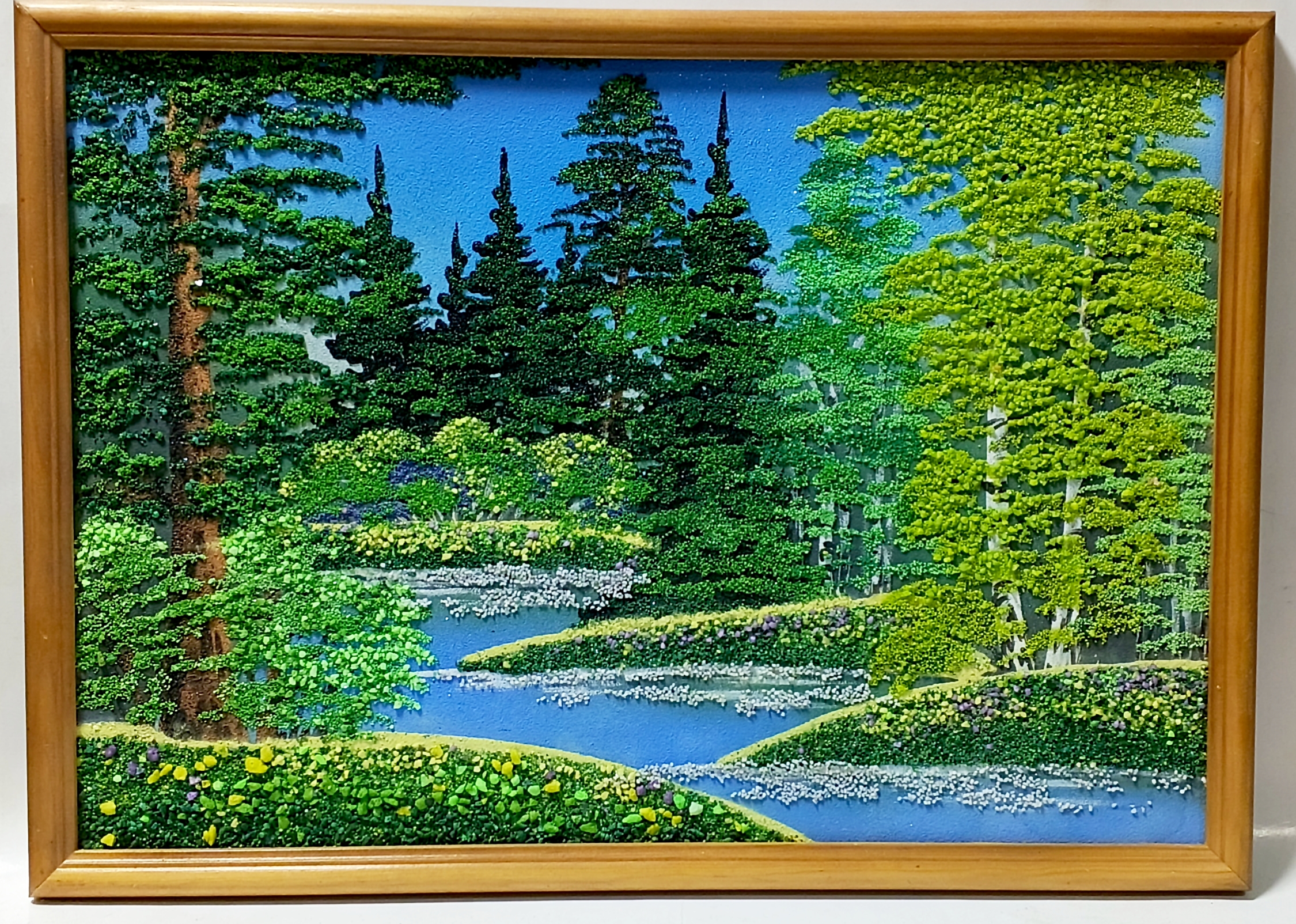 Картина изготовлена вручную натуральной и тонированной каменной крошкой в деревянном багете.