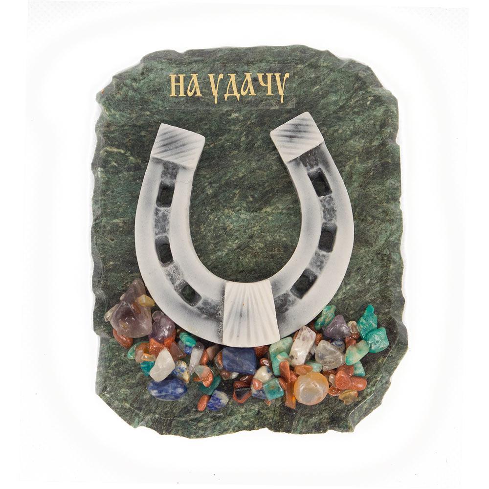 Магнит из змеевика с подковой из литьевого мрамора и самоцветами из яшмы, аметиста, авантюрина и др. уральских камней. Отличный сувенир из камня.