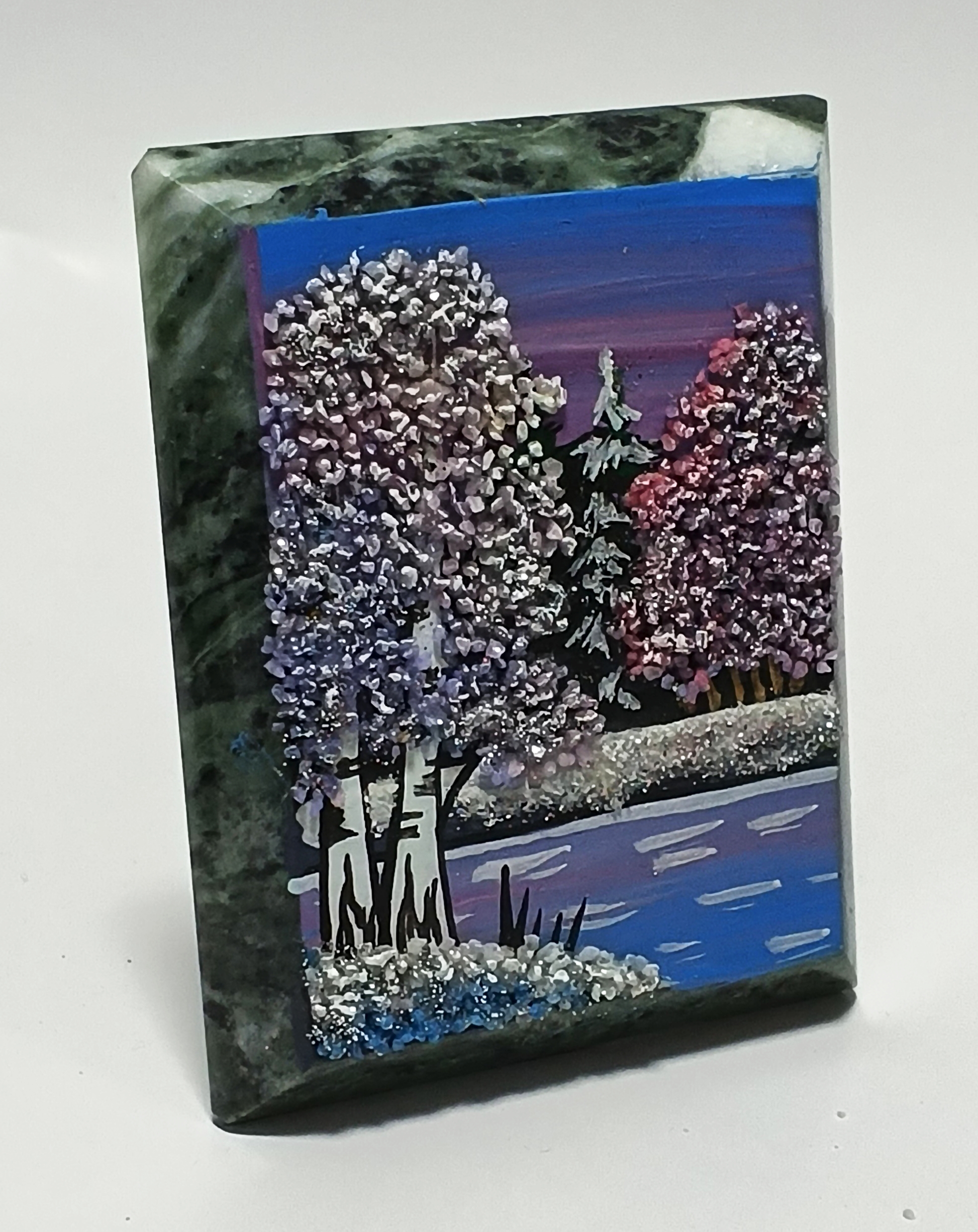 Панно изготовлена вручную из натурального камня змеевик, рисунок с акрилом и натуральной и тонированной каменной крошкой.