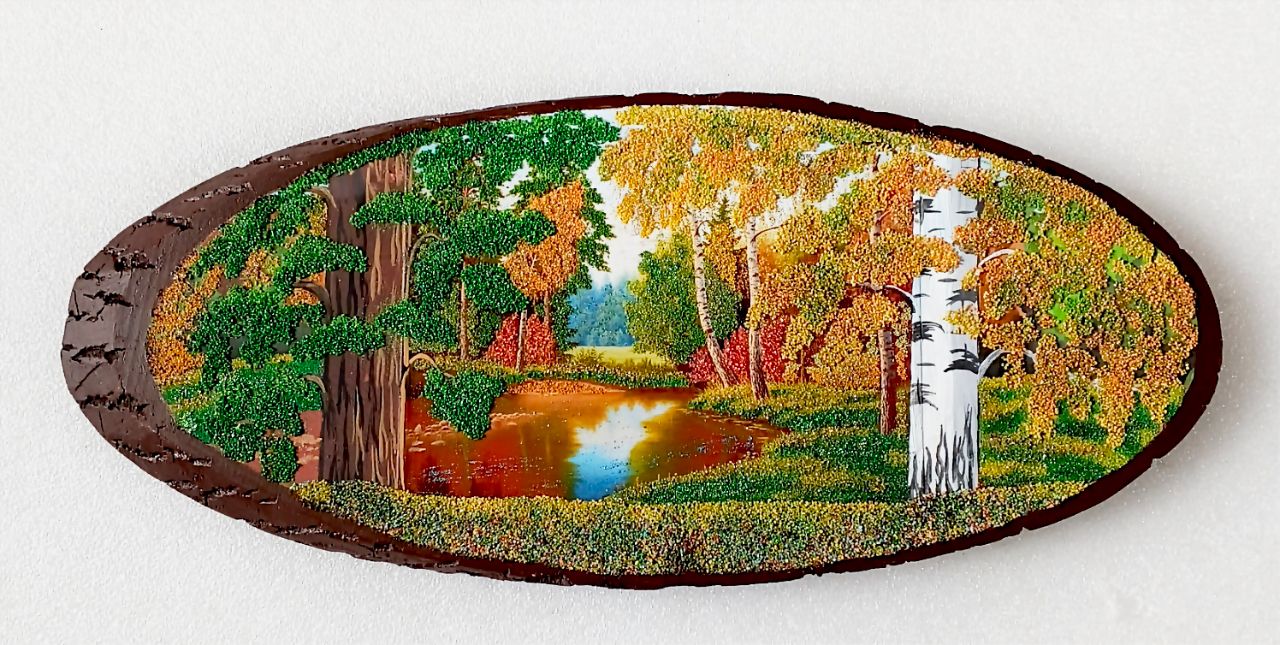 Панно на срезе дерева (осина) изготовлено вручную натуральной и тонированной каменной крошкой .