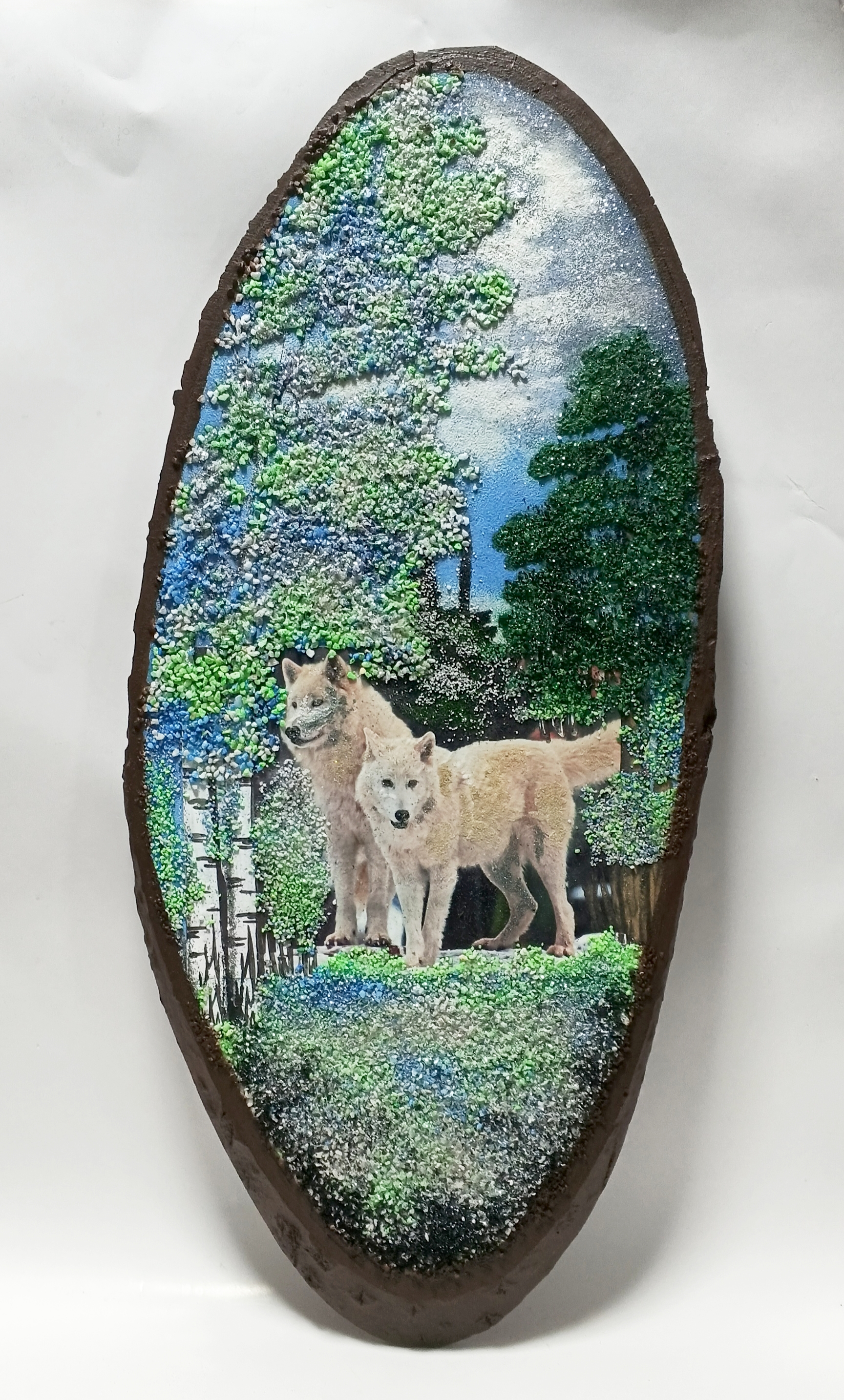 Панно на срезе дерева изготовлено вручную рисунок выполнен натуральной и тонированной крошкой.