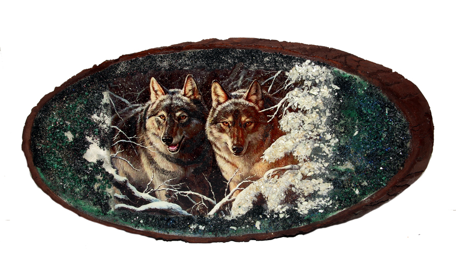 Срез дерева " Пара волков" 55-28-2.5см вес1.5кг репродукция с подсыпкой натуральными минералами: малахит,змеевик,кварц,мрамор"и исскуственно вырашенными алмаз, диоксид кремния изготовлен вручную из осины.