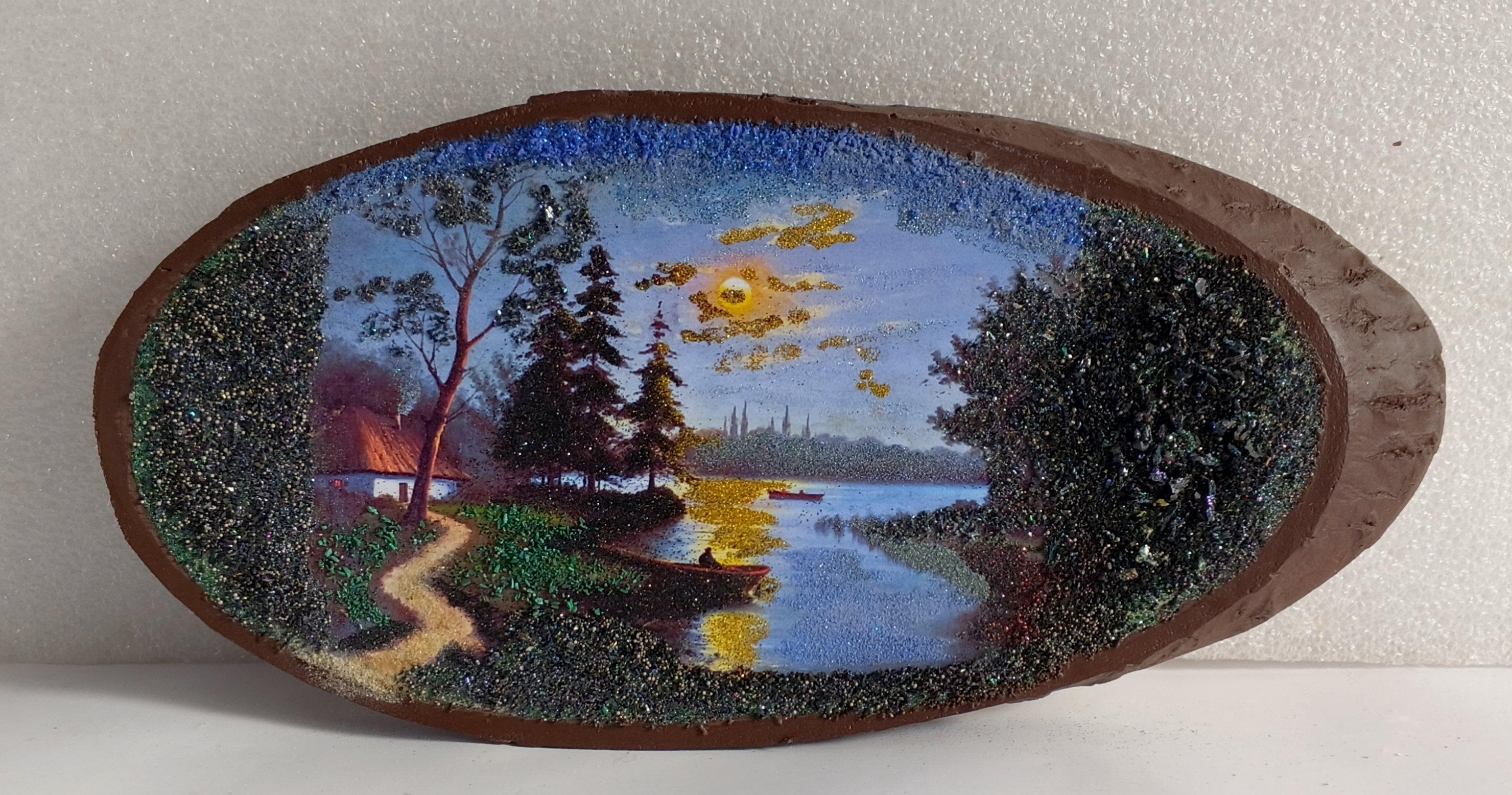 Срез дерева " Полнолуние" рисованный камнем 37-18см .