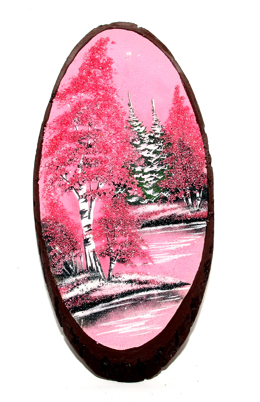Срез дерева" Рубиновый закат" 43-21-2.5см вес 80гр. изготовлен вручную рисунок из натуральных и тонированных минералов.
