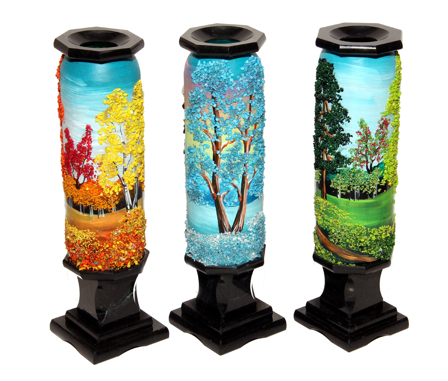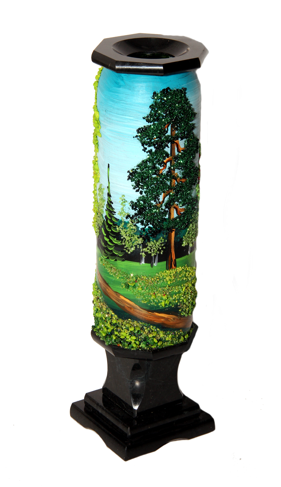 Ваза из змеевика с рисунком каменной крошкой 30.5-8-8 см вес 1.2 кг изготовлена вручную с рисунком акрилом и натуральной каменной крошкой.